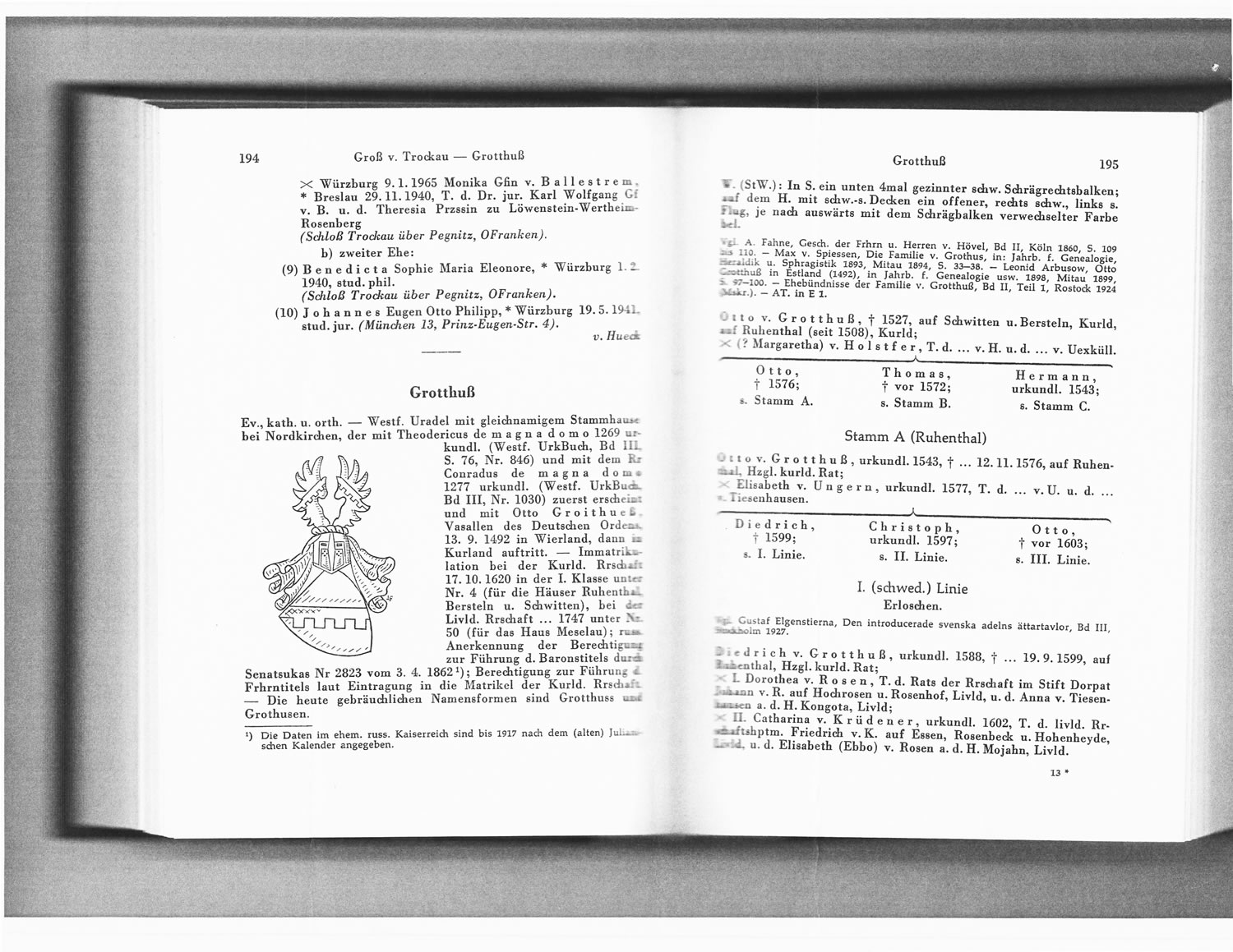 | Johann Adolph von Grothausen Added: 28 Apr 2007 The article on pages 194 and 195 deals mostly with the Eastern German branch of the Grotthuss family. GROTTHUSS Evangelical, Catholic, and Orthodox--A Westphalian ancient noble [family] with an ancestral home of the same name near Nordkirchen [North Church] which first appears documented with Theodericus de magna domo [of the great house] in 1269 (Westphalian Registry, Vol. III, page 76, No. 846) and with the Knight Conradus de magna domo in 1277 (Westphalian Registry, Vol. III, No. 1030) and with Otto Groithuess, Vassal of the German Order, September 13, 1492, in Wierland, [and who] later appeared in Courland [an area to the east along the Baltic Sea]. Registry among the Courland nobility [was entered] on October 17, 1620, in the first class under No. 4 (for the houses of Ruhenthal [Peaceful Valley], Bersteln, and Schwitten), with the LIVLD[?] nobility...in 1747 under No. 50 (for the House of Meselau); Russian recognition of the right to bear the title Baron, through Senatorial Decree No. 2823 of the 3rd day of April, 1862. The right to bear the title of Baron allows entrance into the registry of the nobility of Courland.