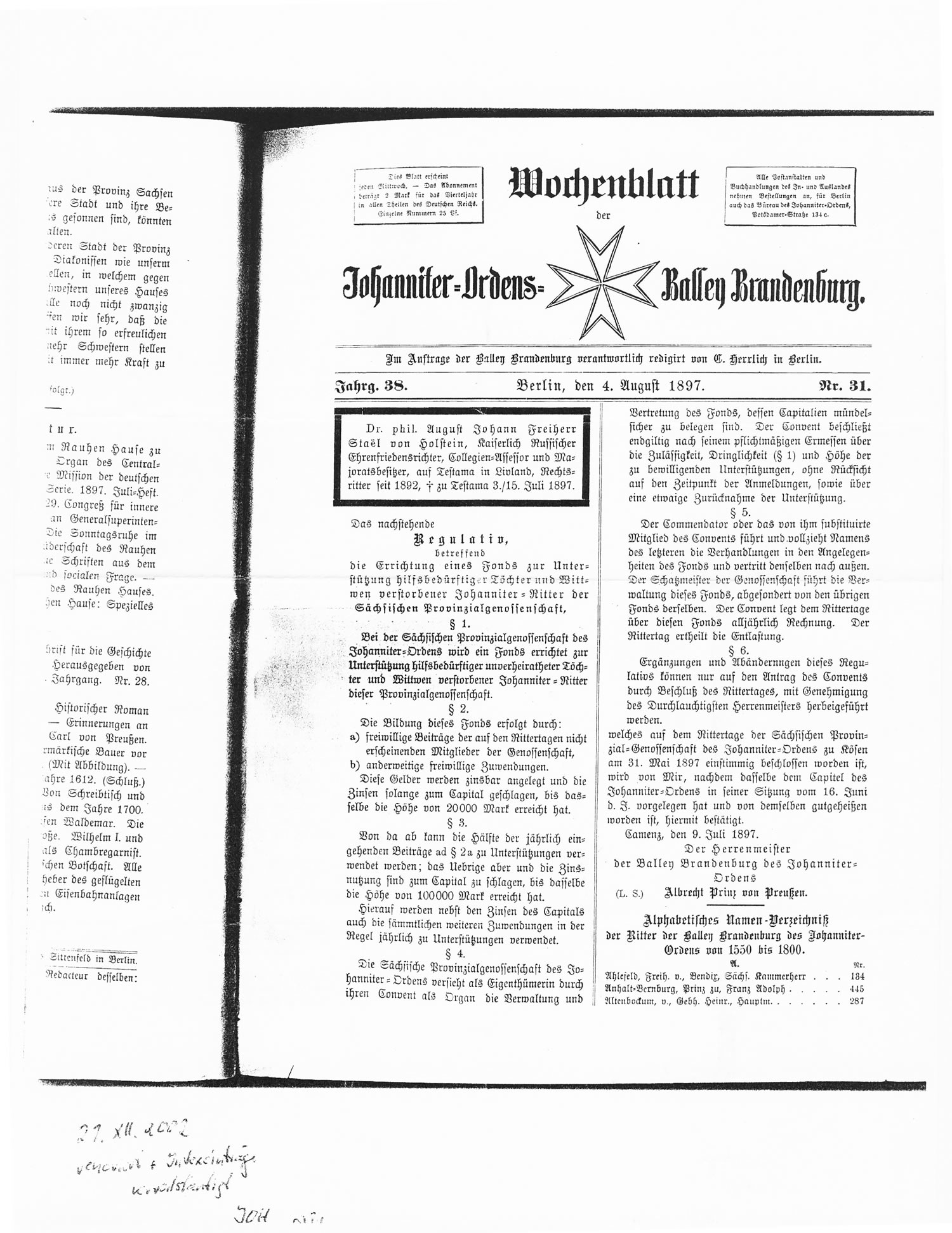 | Johann Adolph von Grothausen Submitted by: Pat Schulze Pat Schulze obtained the following documents from the German Biographic Aristocracy Repertory of the Institut German Aristocracy Research regarding information on Johann Adolph von Grothausen induction into the Balley Brandenburg, Knights of St. John of Jerusalem.