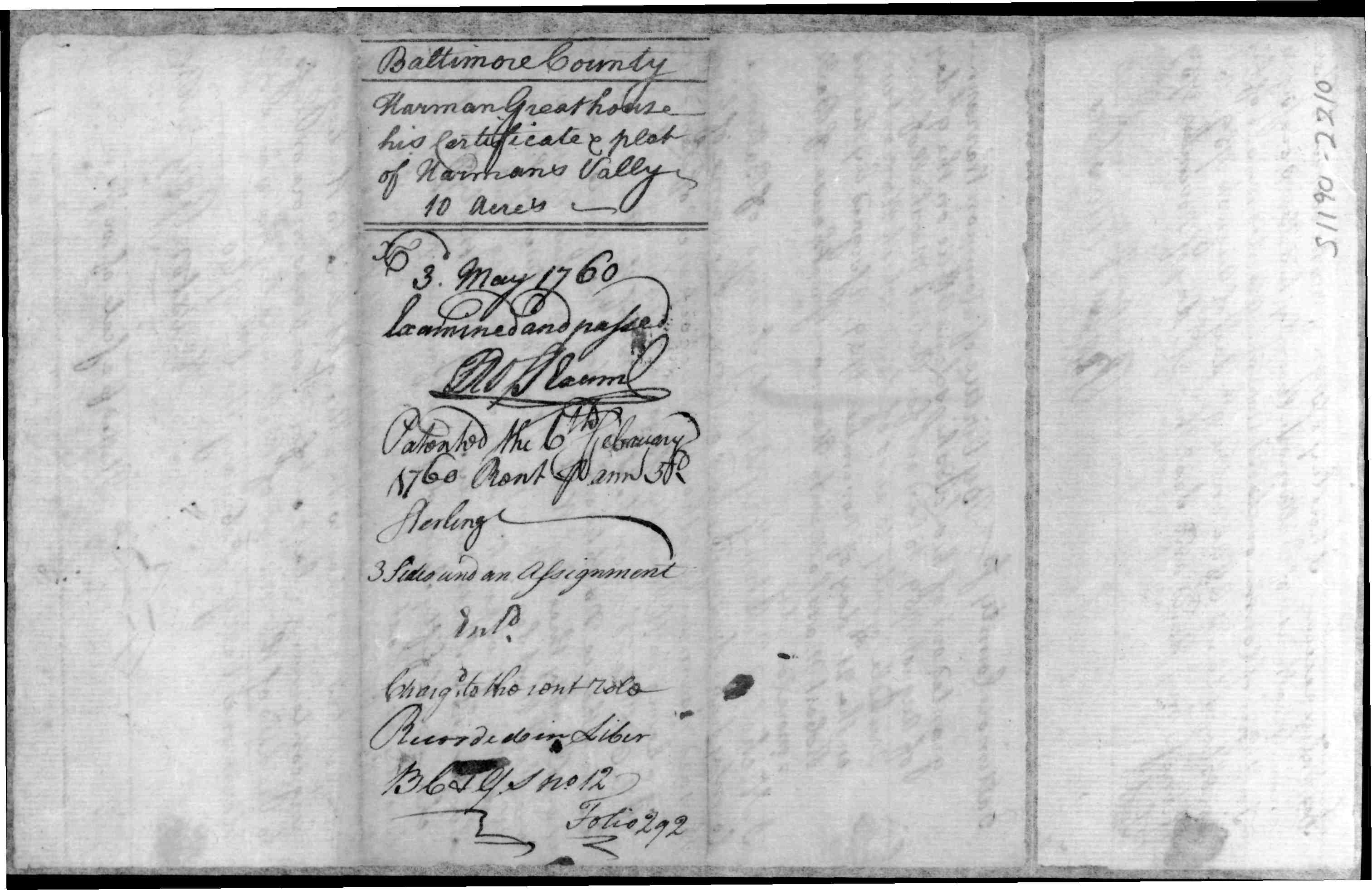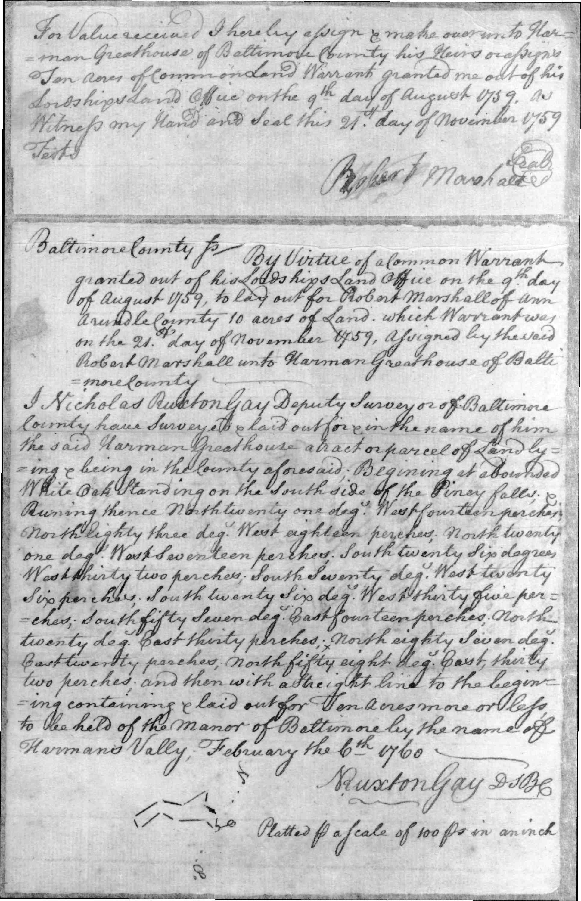 1759, Nov 21 - Land: Harman Greathouse, Harmans Valley Robert Marshall to Harman Greathouse } Warrant [ Page 2 | Page 3 ] Baltimore County vis. By Virtue of a Common Warrant granted out of his Lordships Land Office on the 9th day of August 1759, to lay out for Robert Marshall of Ann Arundle County 10 acres of land, which Warrant was on the 21st day of November 1759, assigned by the said Robert Marshall unto Harman Greathouse of Baltimore County... I Nicholas Ruxton Gay Deputy Surveyor of Baltimore County have Surveyed & laid out for & in the name of him the said Harman Greathouse a tract or parcel of Land lying & being in the County aforesaid, Beginning at a bounded White Oak Standing on the Southside of the Piney falls & Running thence North twenty one degr. West fourteen perches, North Eighty three degr. West eighteen perches, North twenty one degr. West Seventeen perches, South twenty Six degr.ees West thirty two perches, South Seventy degr., West twenty six perches, South twenty Six degr., West thirty five perches, south fifty Seven degr., East fourthee perches, North twenty degr., East thirty perches, North eighty seven degr., East twenty perhces, north fifty eight degr., East thirty two perches and then with with a Straight line to the begining containing & laid out for Ten Acres more or less to be held of the Manor of Baltimore by the name of Harmans Vally, February the 6th 1760. NRuxton Gay DSBC Platted to a scale of 100 Ps in an inch Certificate No. 2210 [ Page 1 ] Baltimore County; Harmans Valley; acres: 10; Surveyed for Harman Greathouse, February, 6, 1760; Ex'd and Passed: 3 May 1760; Patented to Harman Greathouse, 6 February 1760; Rec. of Cert.: B.C. & G.S. No. 12, Fo. 292. Tract Index references survey and patent certificate as: Reference: Patent Record BC and GS 12, p. 292 Reference: Patent Record BC and GS 13, p. 505 Footnotes: