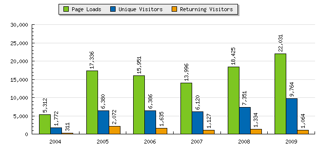 31 Dec 2009 The usage statistics are in for year 2009. We are delighted to have served more visitors in 2009 than any other Jan-Dec year, since tracking began in July 2004. From Jan-Dec 2009, more than 9,700 visitors shared in the research we have presented on Greathouse Point. Graph showing a record year for 2009 versus previous years: